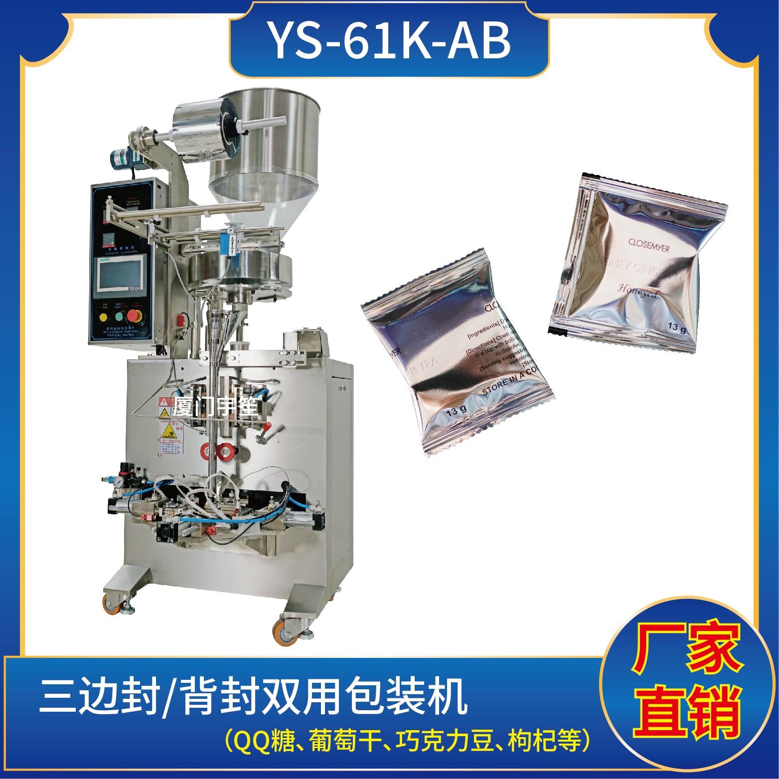 YS-61K-AB 三邊封/背封雙用包裝機特點(diǎn)1、適用于食品、醫藥、化工、化妝品行業(yè)中顆粒物品的計量包裝。2、可自動(dòng)完成制袋、計量、下料、封合、分切、計數、且可根據客戶(hù)要求配置打印批號等功能。3、觸摸屏操作,PLC 控制,驅動(dòng)步進(jìn)電機控制袋長(cháng),性能穩定、調整方便、檢測準確。智能式溫控儀,PID調節,保證將溫度的誤差范圍…