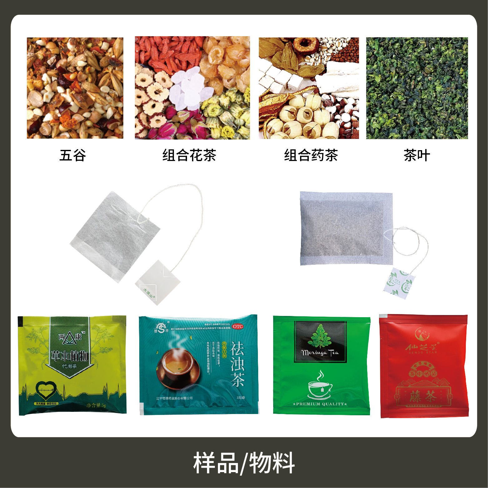 5、包裝材料:茶葉濾紙、棉線(xiàn)、復合膜及標簽。